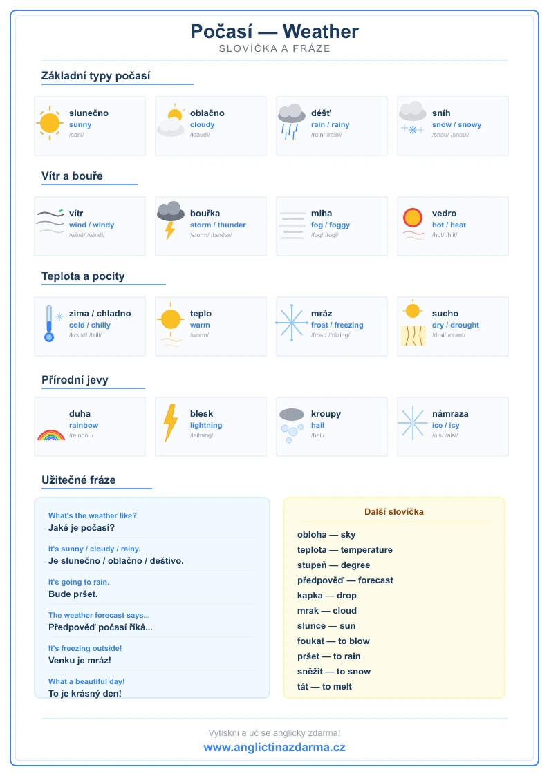 Kompletní přehled slovíček o počasí na jednom místě. Klikněte na obrázek pro zvětšení, stažení nebo tisk ve formátu A4.